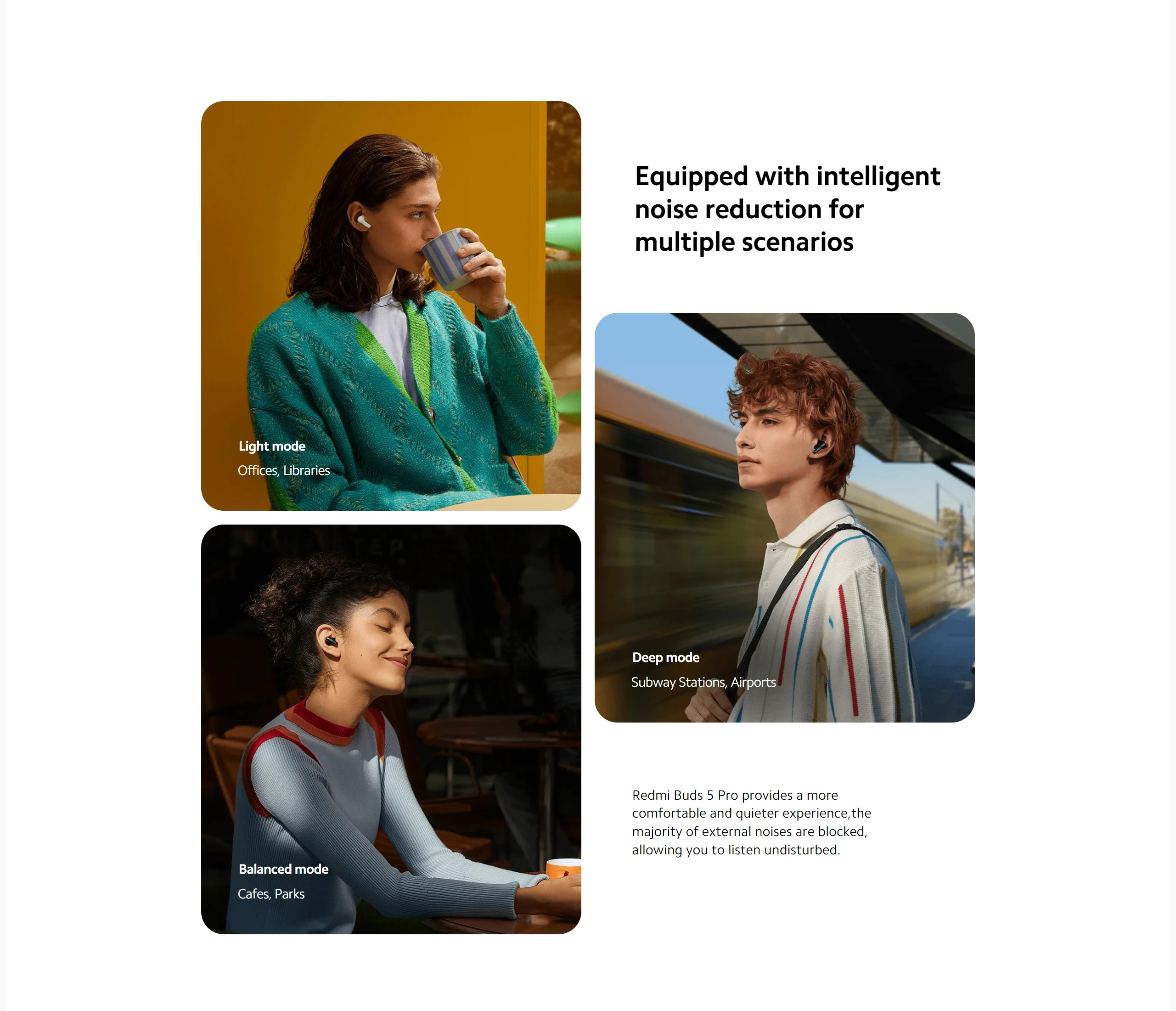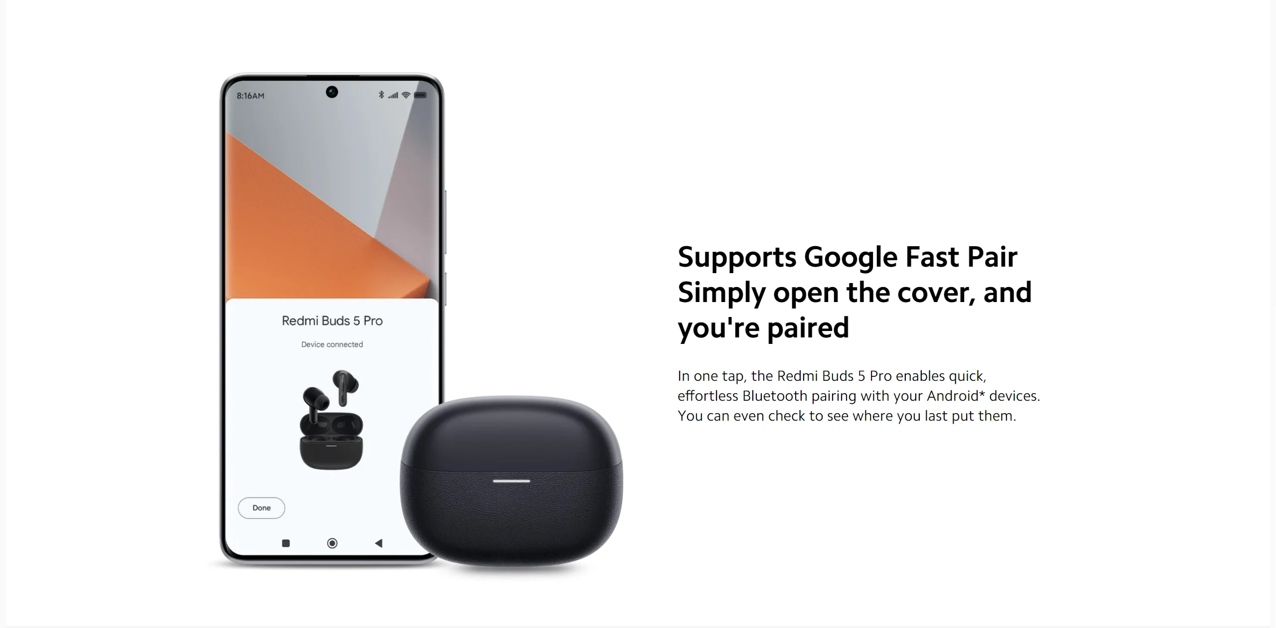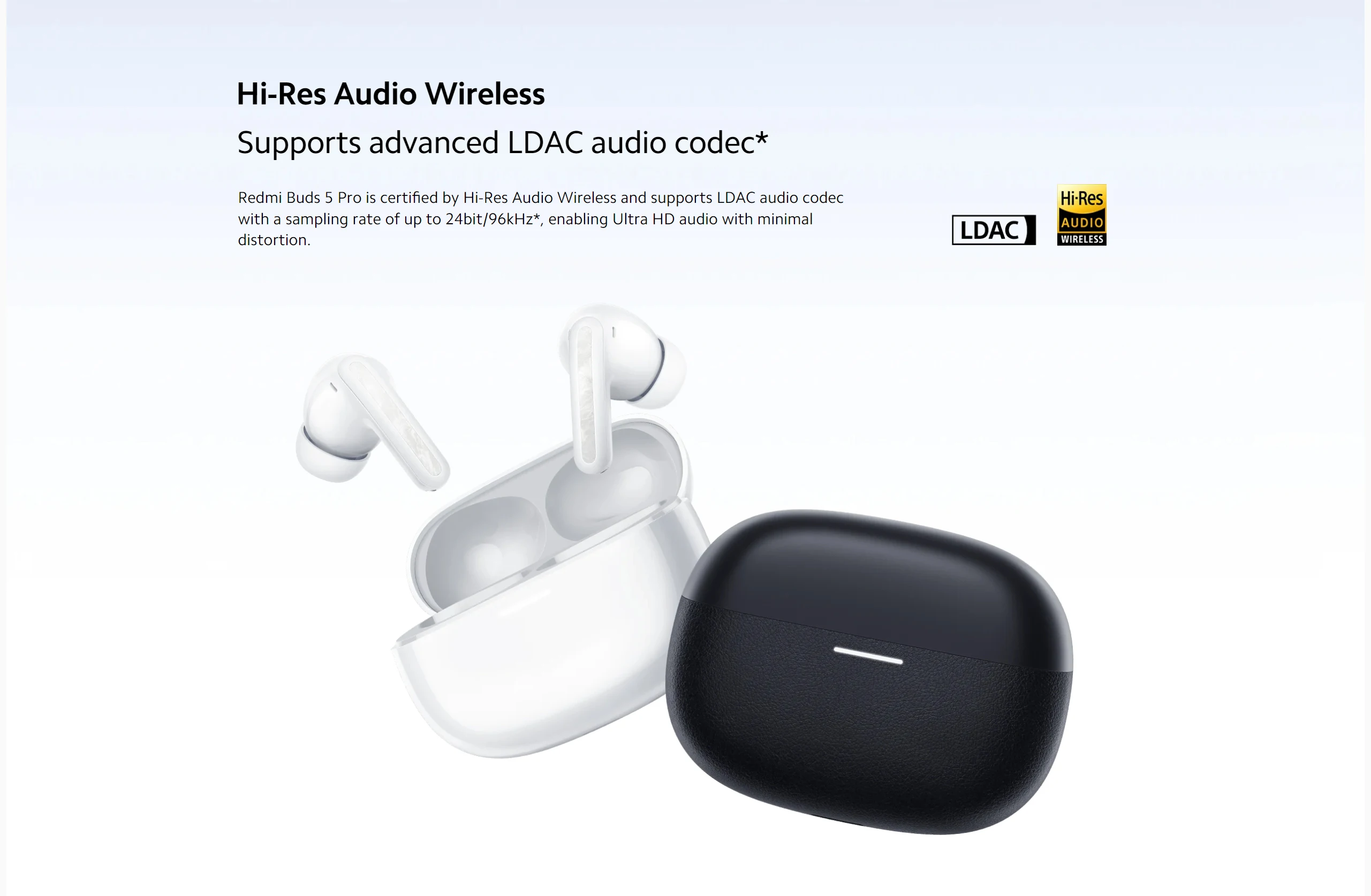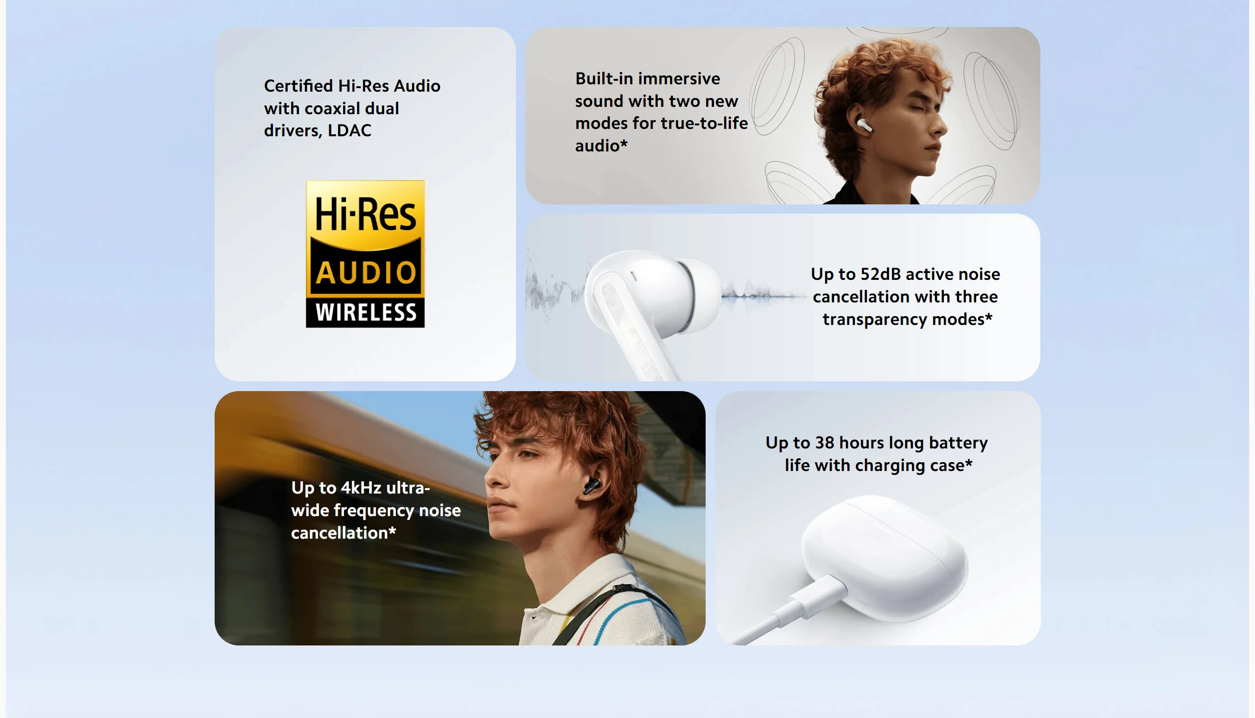 *Battery life and fast charging test conditions: 38 hours data based on Redmi Note 13 Pro 5G (MIUI Global 14.0.23) and earbuds version V4.3.7.0. Earbuds’ battery level was 100% with earbuds’ volume adjusted to 50%, Bluetooth encoding mode was AAC, transparency mode and dual-device connection were turned off. Test content: Fully discharge the Redmi Buds 5 Pro battery while playing audio until either earbud stops playing. Ensure that the charging port is free of liquid and foreign objects before charging. Earbud charging and battery life data is derived from internal tests carried out by the manufacturer. Actual results may vary depending on firmware updates, usage conditions, charging level, and environmental factors.