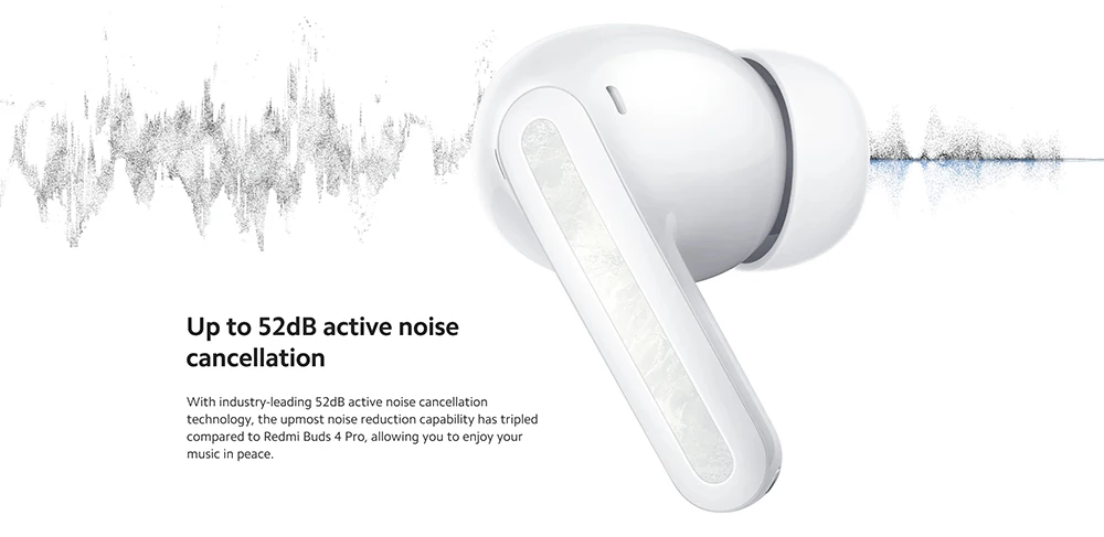 *Active noise cancellation test data is provided by the National Institute of Metrology, China. The product achieved 52dB ANC depth within a particular frequency range and 4kHz at a specific depth range, but not simultaneously. Tests were conducted separately. Actual results may vary with usage. Touching and holding either earbud only enables switching between the ANC and transparency modes by default. ANC and transparency mode settings available only on the Xiaomi Earbuds app.