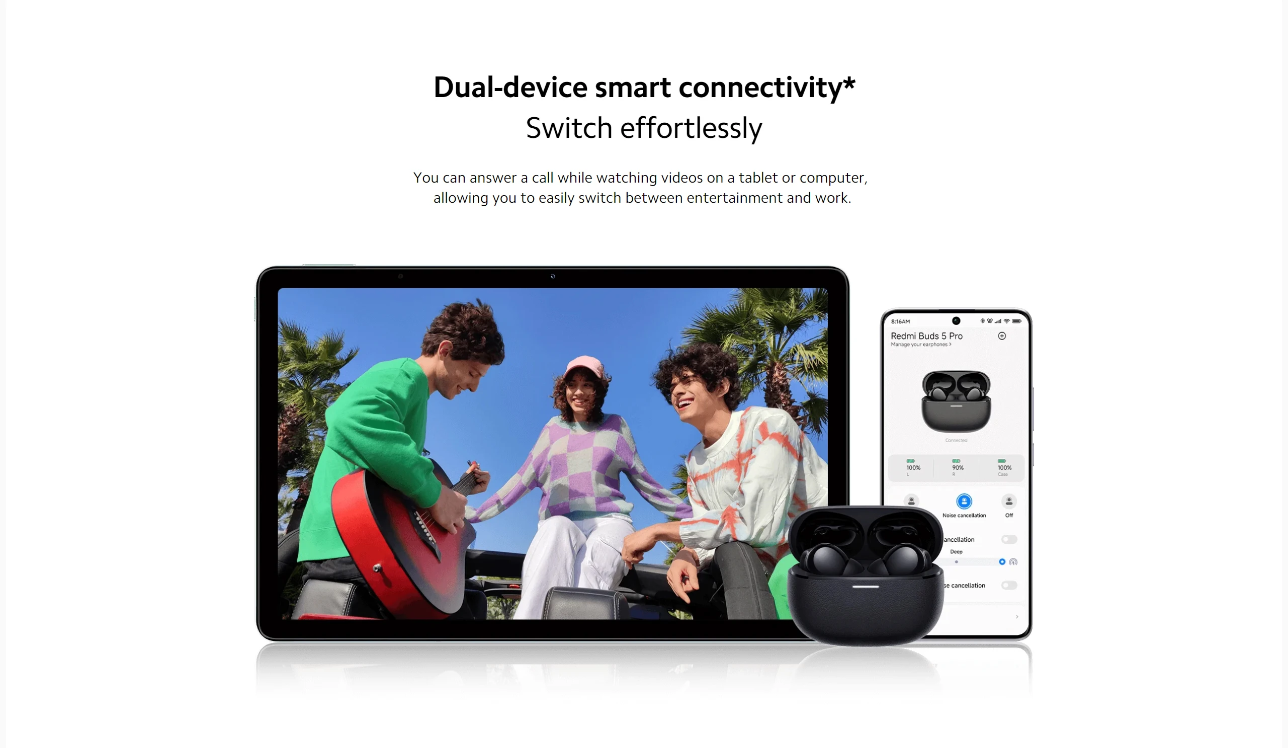 *Dual-device connectivity is switched off as default, experience may vary depending on the device. Please download the Xiaomi Earbuds App to switch on. Third-party applications are required to support synchronous pausing or resuming when answering or ending phone calls. Feature name may differ from actual settings. To enjoy using with two devices, switch on the function via the Xiaomi Earbuds App on one device only and connect the second device via Bluetooth.